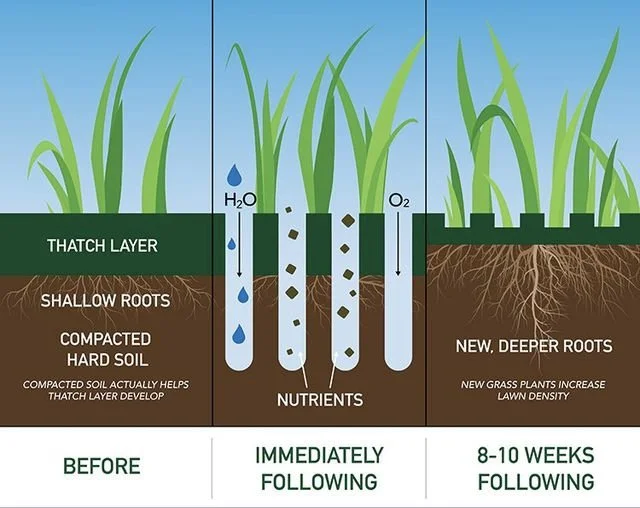 - Core Aeration: We use a core aerator to remove small plugs of soil, reducing compaction and promoting healthy root growth.